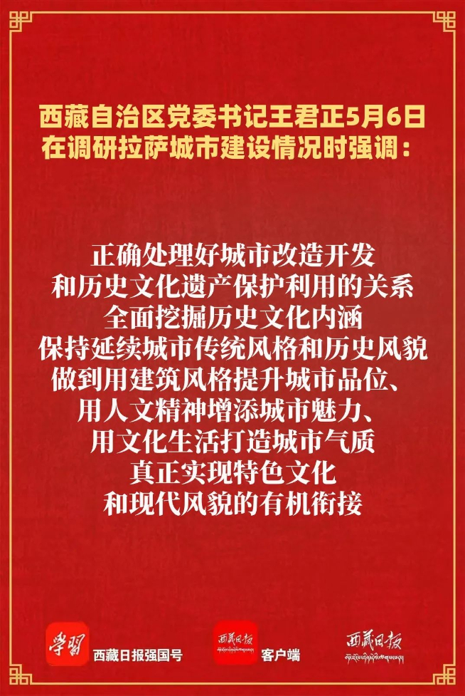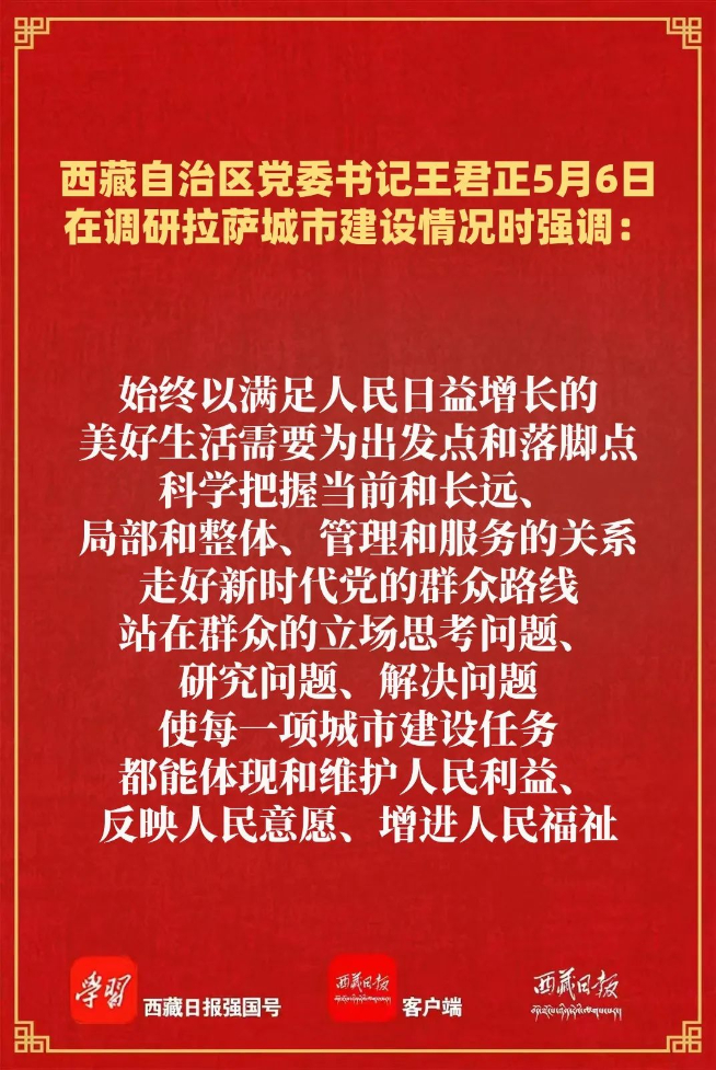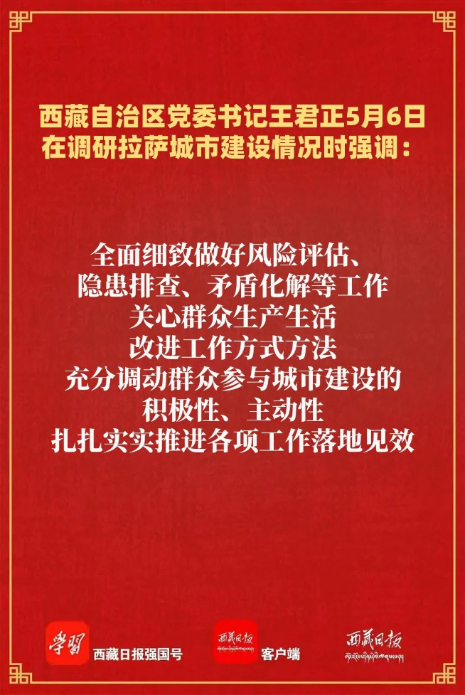 5月6日,自治区党委书记王君正实地调研拉萨城市建设情况。强调,要深入贯彻落实习近平总书记关于城市工作的重要论述,坚持以人民为中心的发展思想,不断提高城市规划建设管理水平,为人民群众提供良好的工作和生活环境。