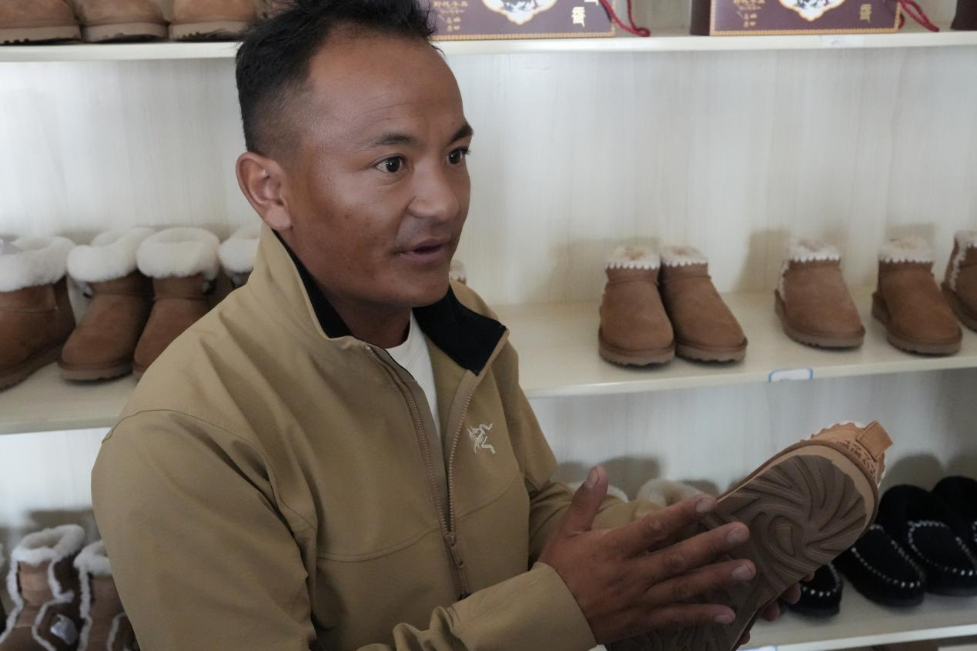 图为普若岗日牧业发展有限公司经销商负责人罗培在介绍羊皮雪地靴(9月6日摄)。新华网发 林玥儿 摄