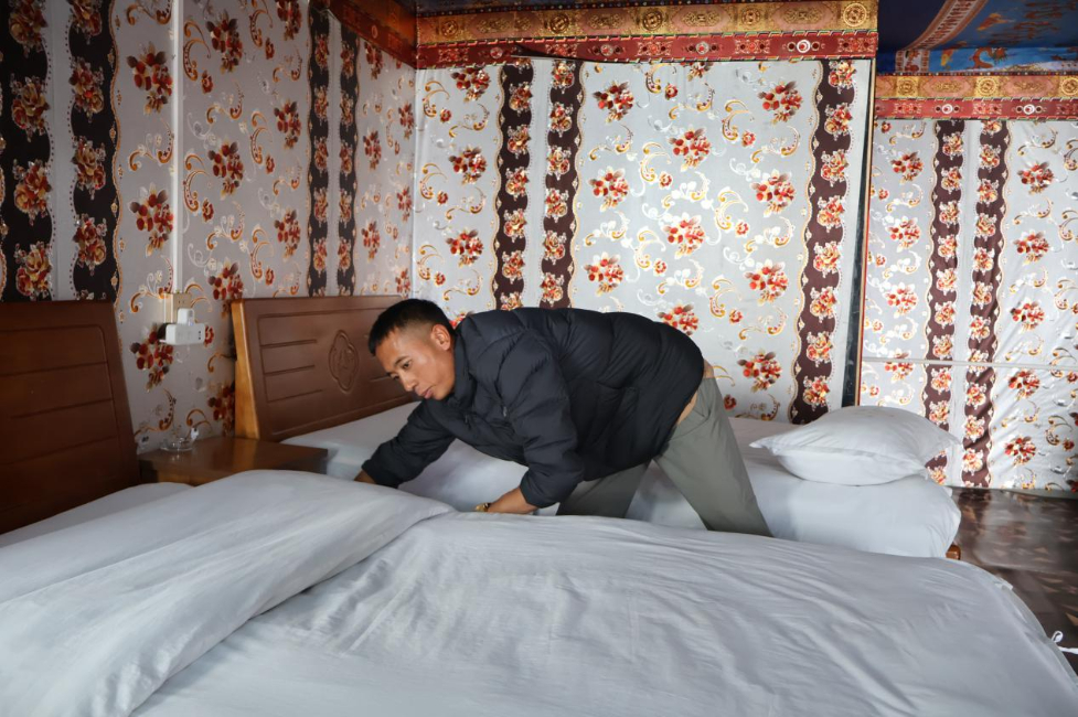 在当惹雍错北岸的尼玛县文部南村,返乡创业青年永忠在自家民宿接待游客。这座藏北小村落既保留着古象雄文化遗迹,又焕发着文旅融合的新活力。“我今年已经把贷款还清了,周边的邻居还跟着我一起办起了民宿,3年下来带着大家共增收30余万元。”永忠说。