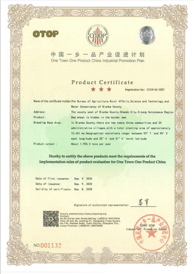 经综合评估,专家组一致认为,“边坝藏红麦”在传统特色传承、产业规模拓展、质量水平把控、品牌联农带农等方面均达到“中国一乡一品”认证标准,成功通过现场评审。值得一提的是,此前边坝藏红麦已先后通过绿色认证、成功注册地理标志证明商标、获得有机转换认证证书,并被纳入全国名特优新农产品名录,此次斩获“中国一乡一品”称号,进一步丰富了其品牌“含金量”,实现千年农耕文明与现代质量标准的深度融合。