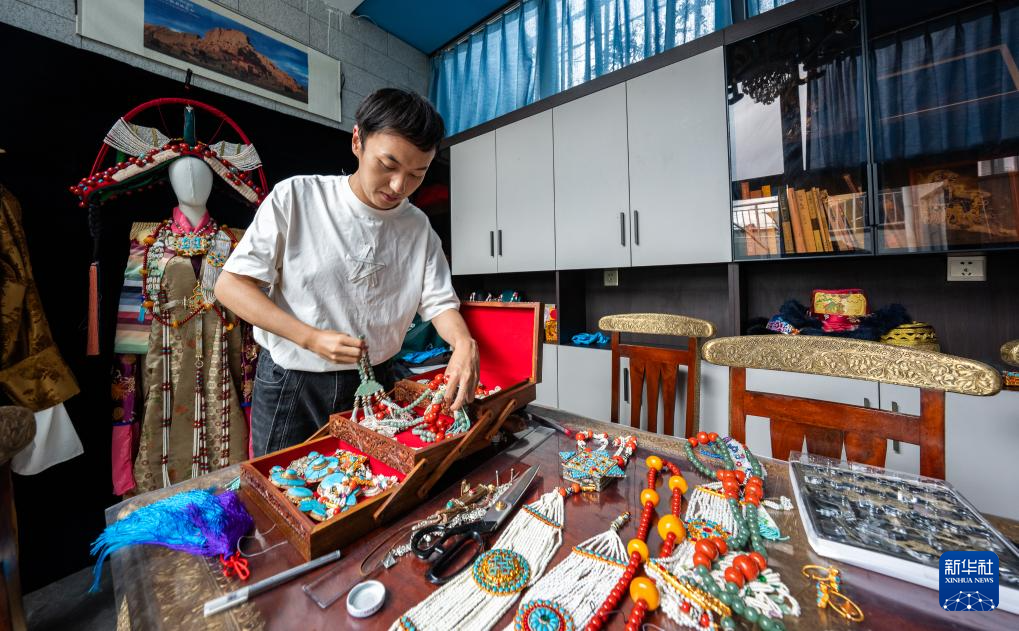 班珠丹塔在家中工作室内整理自己做的藏式配件(9月11日摄)。新华社记者 丁增尼达 摄