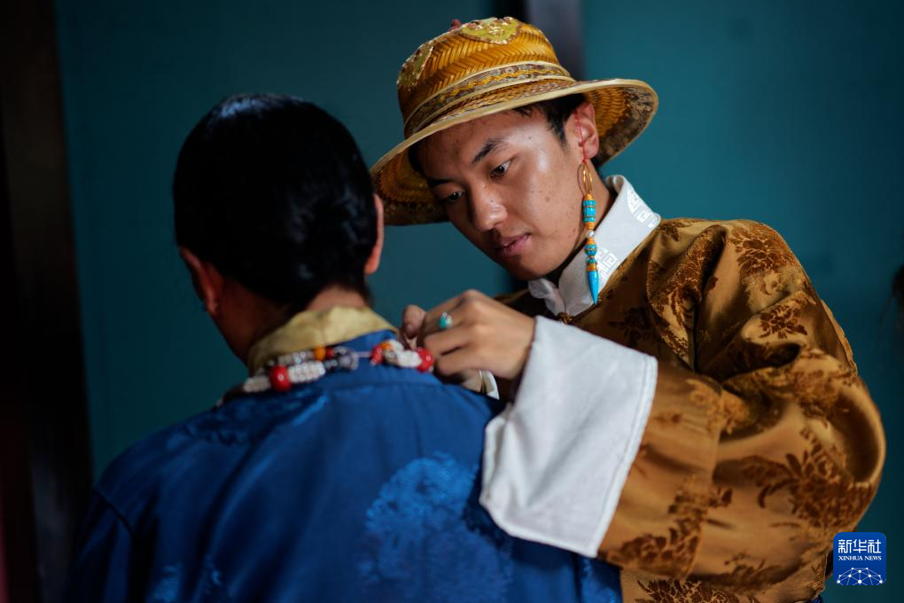 班珠丹塔(右)在穿自己设计的男士旅行服(9月9日摄)。新华社记者 晋美多吉 摄