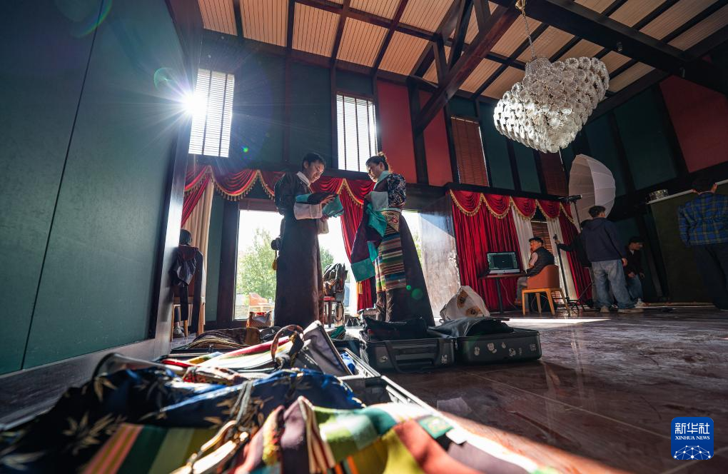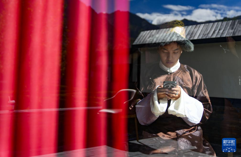 班珠丹塔在棚拍间隙处理工作事宜(9月9日摄)。新华社记者 晋美多吉 摄
