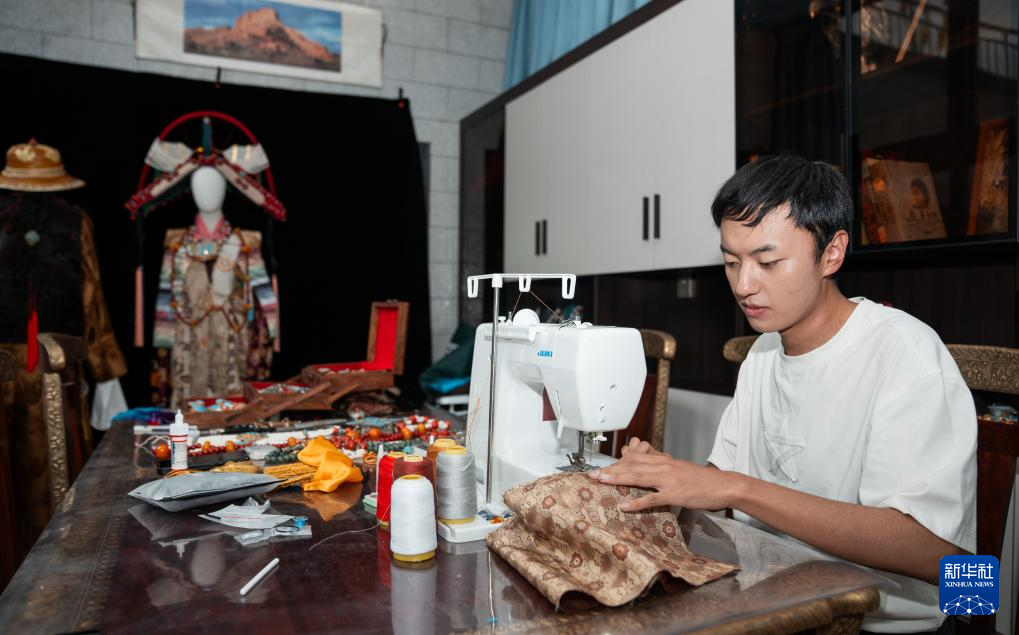 班珠丹塔在家中工作室内缝制藏装(9月11日摄)。新华社记者 丁增尼达 摄