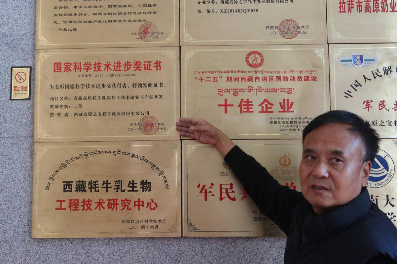 西藏高原之宝牦牛乳业股份有限公司党委副书记崔立新正向记者介绍公司荣誉。新华网发 石林巧摄