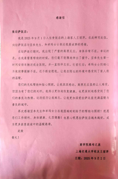 服务的温度,更体现在对人的关怀上。游客王丽萍在拉萨旅行期间出现了严重高反,饭店工作人员坚参和卓玛主动伸出援手,助其缓解不适,让她在雪域高原上感受到了家一般的温暖。