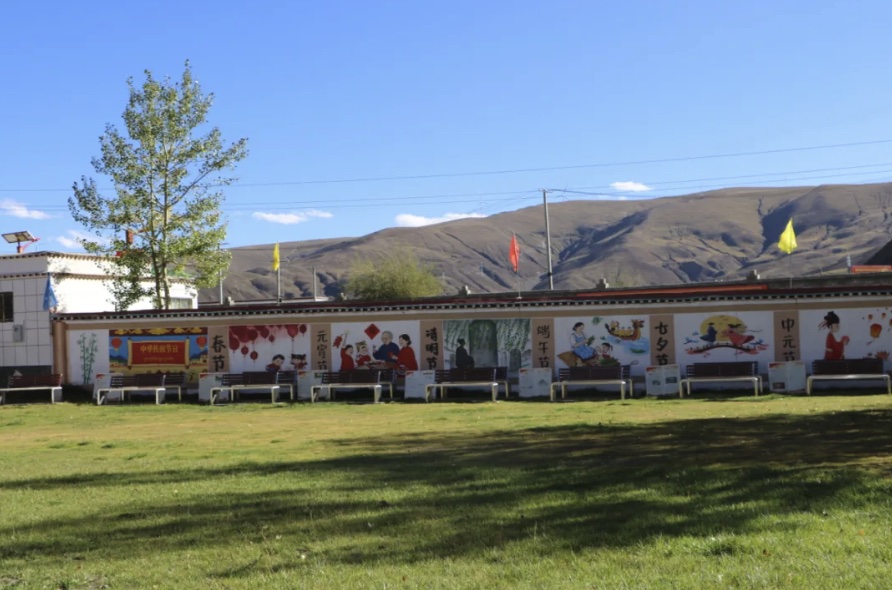 走进琼嘎村民族团结活动中心,目光瞬间被点亮。地面绿草如茵,像铺了块鲜活的绿毯,让人仿佛踏入自然怀抱;四周墙壁则成了“民族文化画卷”,五十六个民族的风貌与中华民族传统节日的场景错落绘制,既有各民族的独特风情,又透着一家人的热闹暖意。