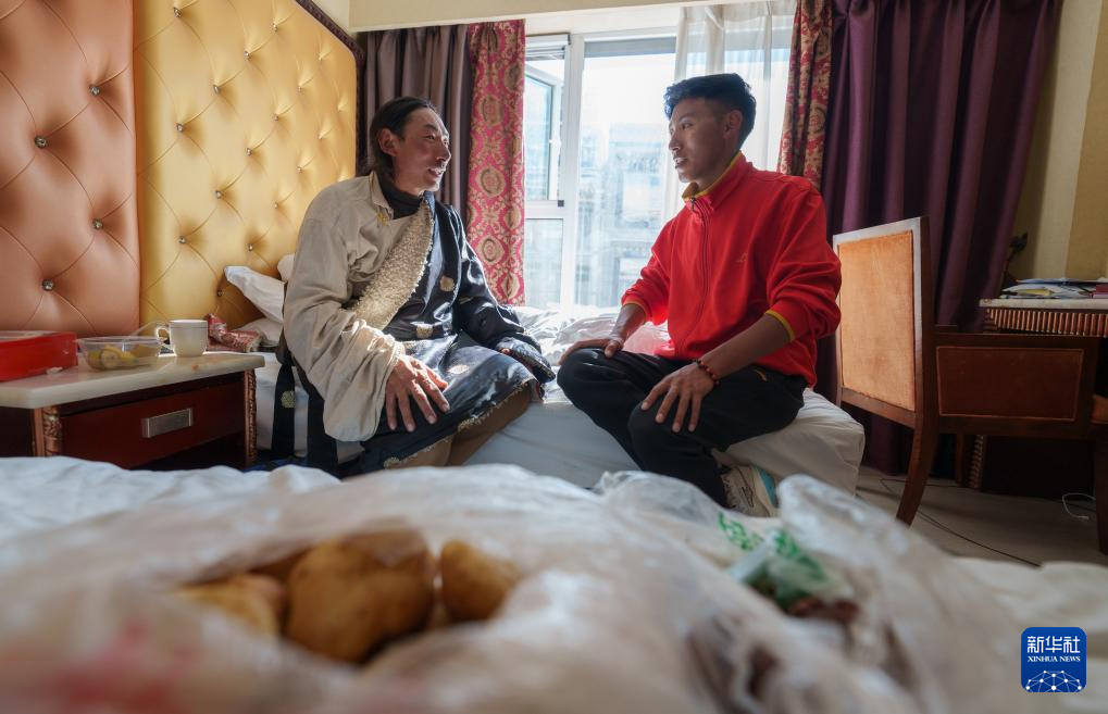 12月5日,索南加参(右)在拉萨的酒店房间中和父亲次仁多杰聊天。新华社记者 丁增尼达 摄