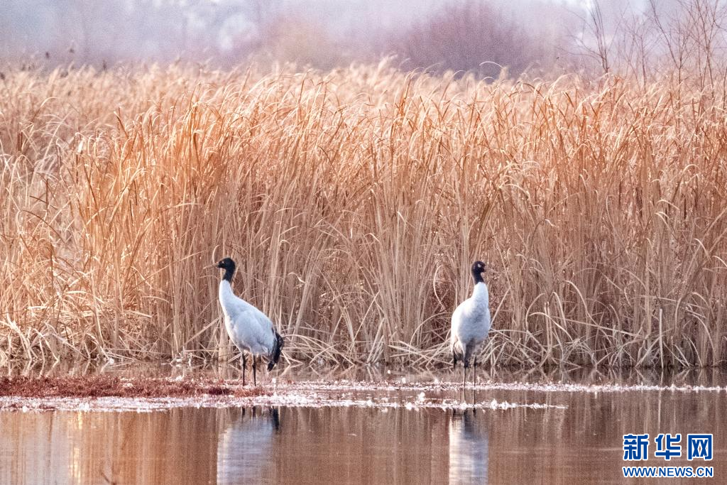 1月9日,在拉萨市拉鲁湿地越冬的黑颈鹤。新华网 旦增努布 摄