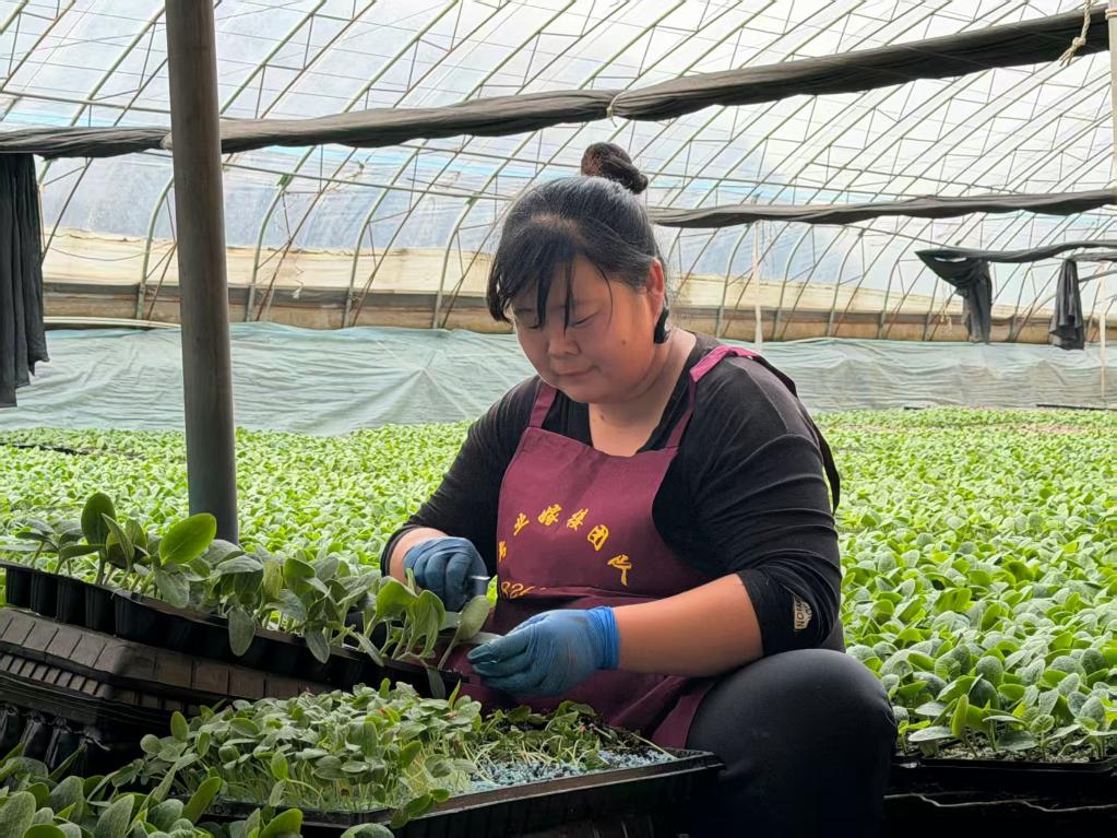 初春,在山东省聊城市莘县董杜庄镇梁丕营村,41岁的马燕正在育苗大棚里嫁接瓜苗。